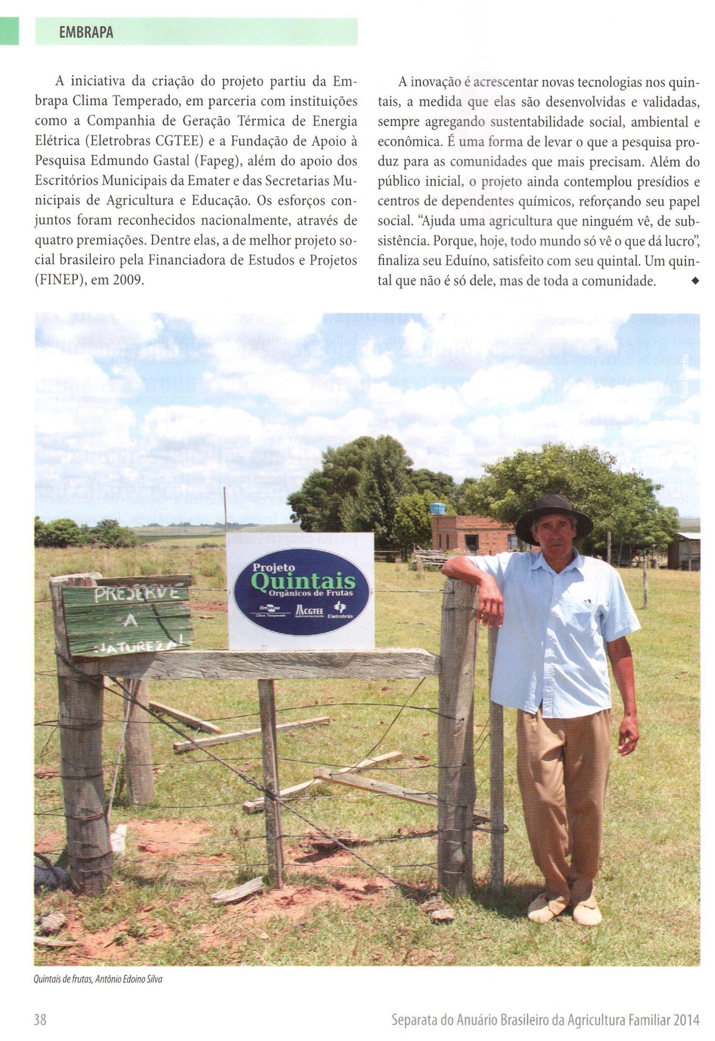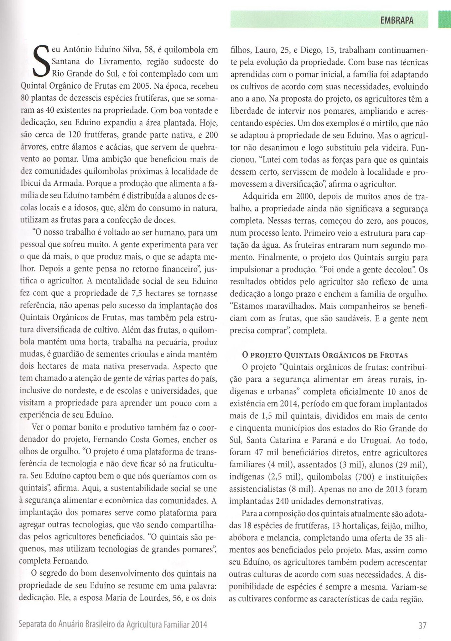 Projeto Quintais aparece na Revista Soluções Tecnológicas e Inovação - A Embrapa no Ano Internacional da Agricultura Familiar, mostrando o quintal do Antônio Eduíno Silva, 58, quilombola em Santana do Livramento, região sudoeste do Rio Grande do Sul, e que foi contemplado com um Quintal Orgânico de Frutas desde 2005.